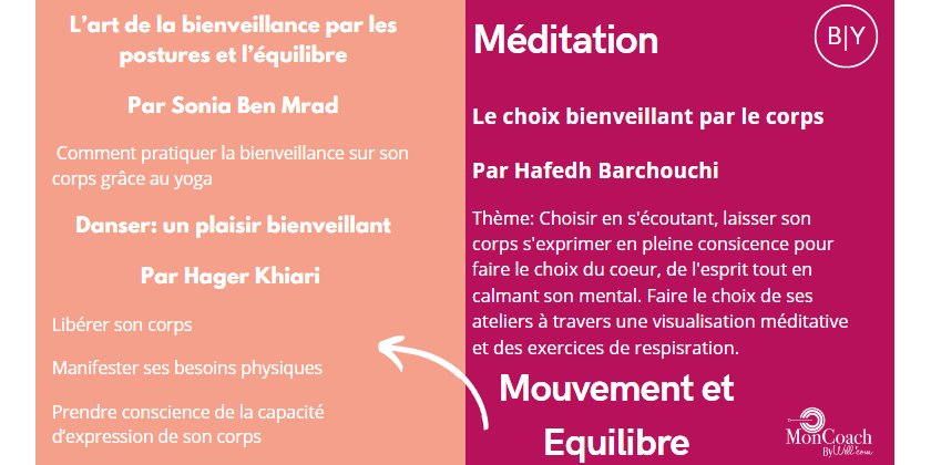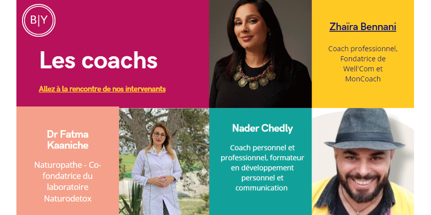 Durant cette journée immersive, les participant.e.s seront accompagné.e.s par des experts de renom : Zhaira Bennani (coaching professionnel), Nader Chadly(coaching persnnel), Hamdi Hadda (coaching théâtral), Amira Hammami (Art thérapie), Lilia Kamoun (parentalité positive), Afnen Zaroug (aménagement des espaces de vie), Selim Kouidhi (intelligence financière), Dr Fatma Kaaniche (health coaching), Sonia Ben M’rad (l’art de la bienveillance par les postures et l’équilibre), Hafedh Barchouchi (méditation) et Hager Khiari (danse).