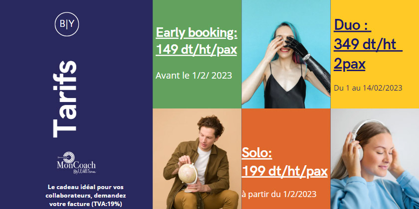 Vous pouvez réserver votre place en solo (199 dt/ht) dès maintenant. En duo, profitez du tarif préférentiel jusqu’au 14 Février: 349 dt/ht au lieu de 398 dt/ht.